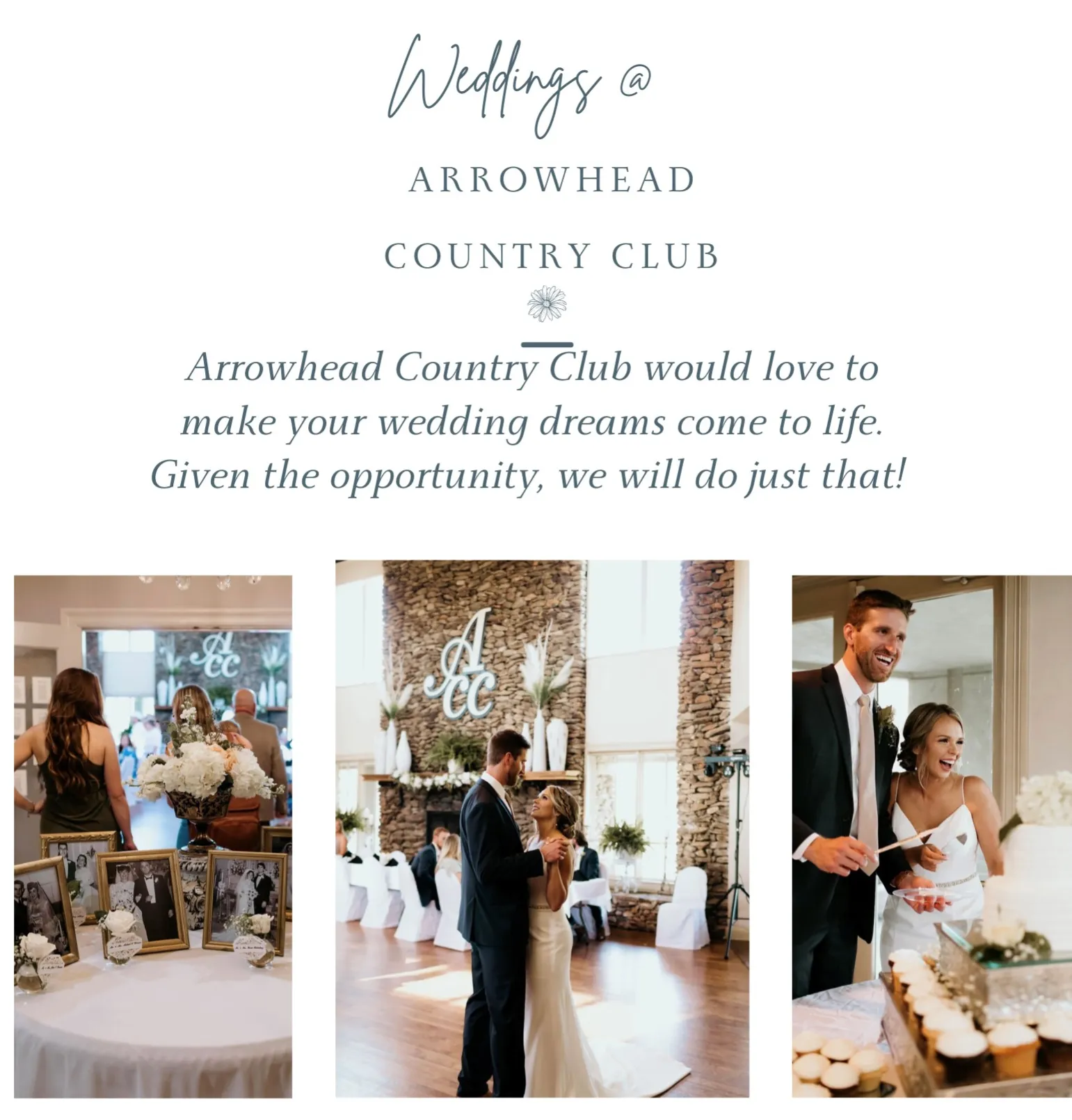 Arrowhead’s meeting and dining facilities include the private Camellia Room, Magnolia Room, Board Room, the Main Dining Room, Fairway Dining Room, and our Ballroom. From intimate events to receptions of many hundreds, a golf outing or a business meeting, we will accommodate your group at Arrowhead Country Club. Members receive reduced pricing on all events, but we also encourage outside events as well from non-members. Come and see how Arrowhead CC can meet your needs with any event.